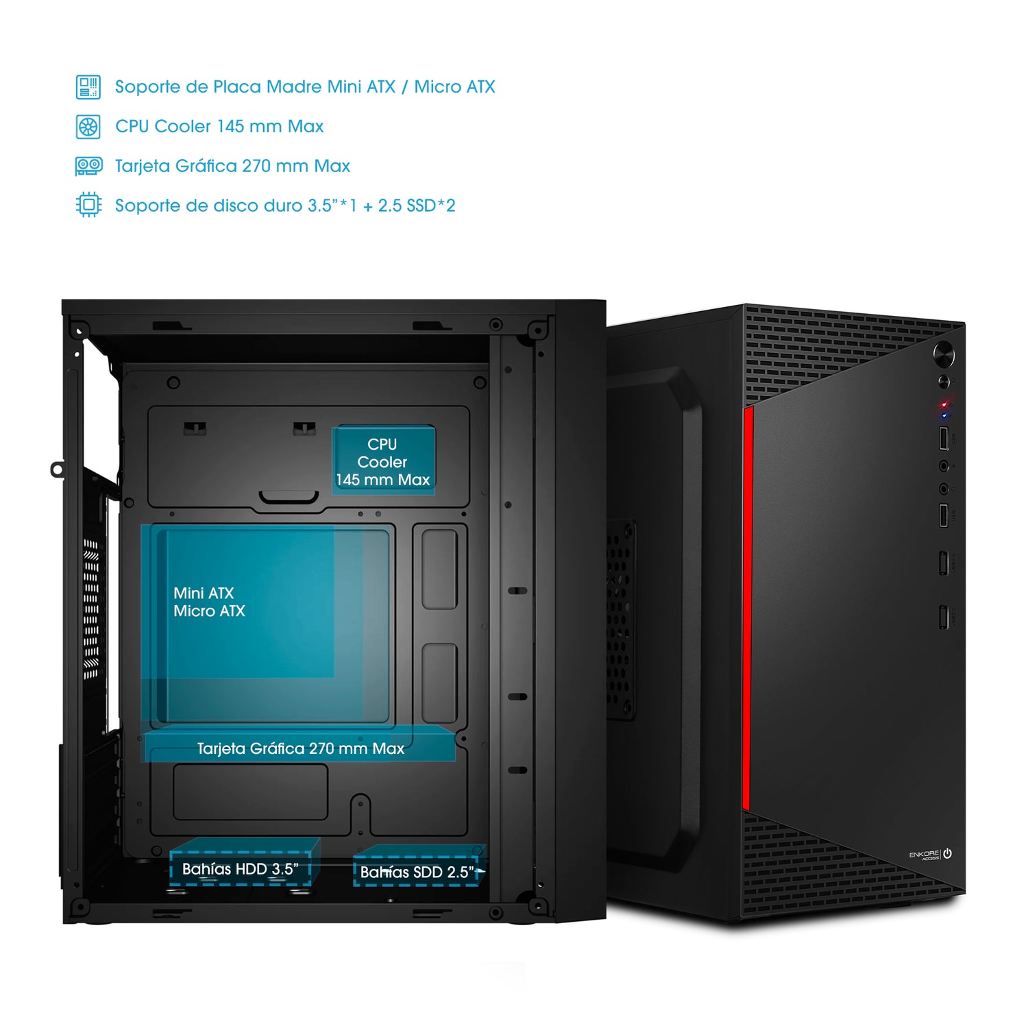 El Gabinete Enkore Access ofrece compatibilidad con placas Micro ATX y Mini ATX, soporta tarjetas gráficas de hasta 270 mm y CPU coolers de hasta 145 mm.