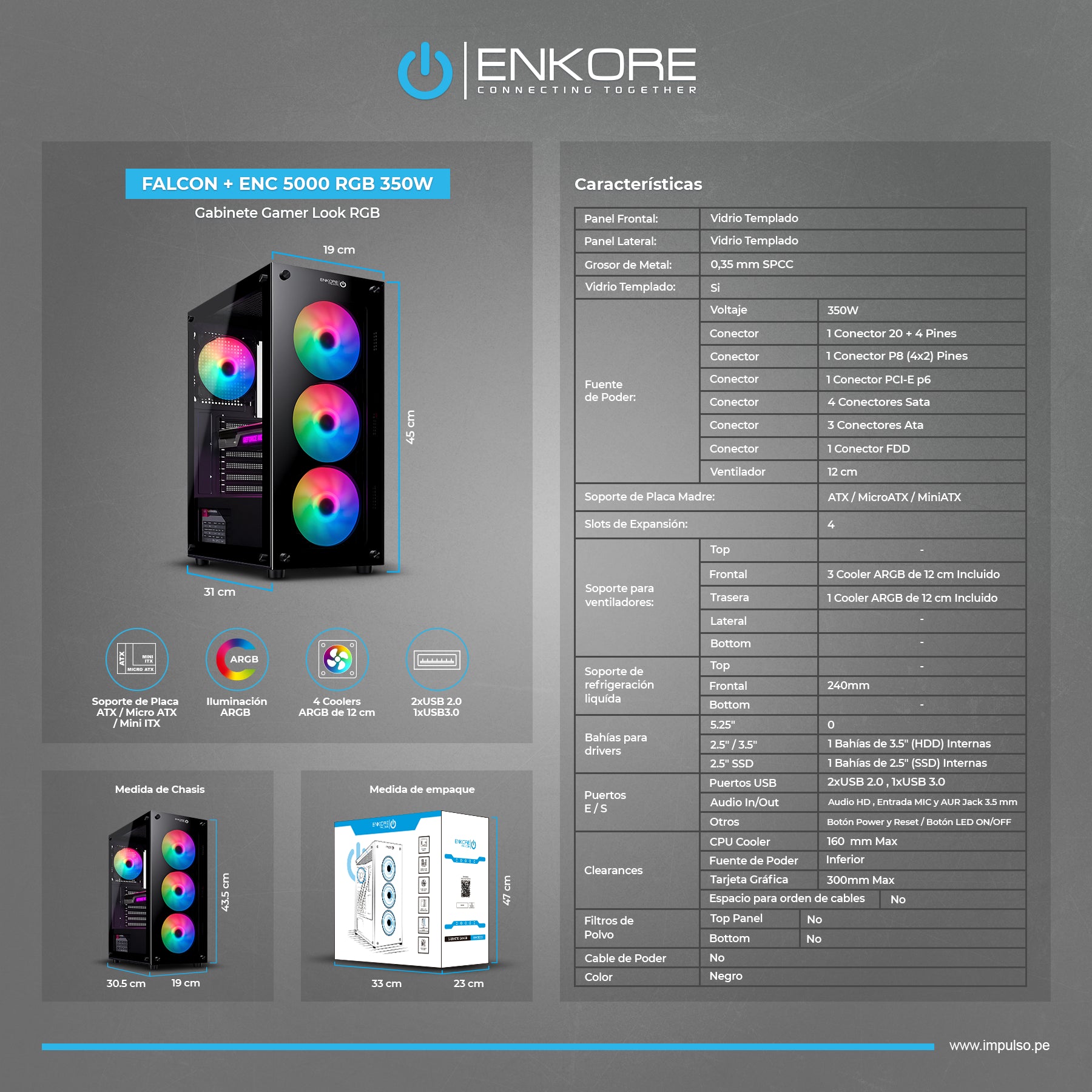 Gabinete Gamer ATX con Fuente de 350W 4 Coolers ARGB Falcon + ENK 5000 RGB 350W