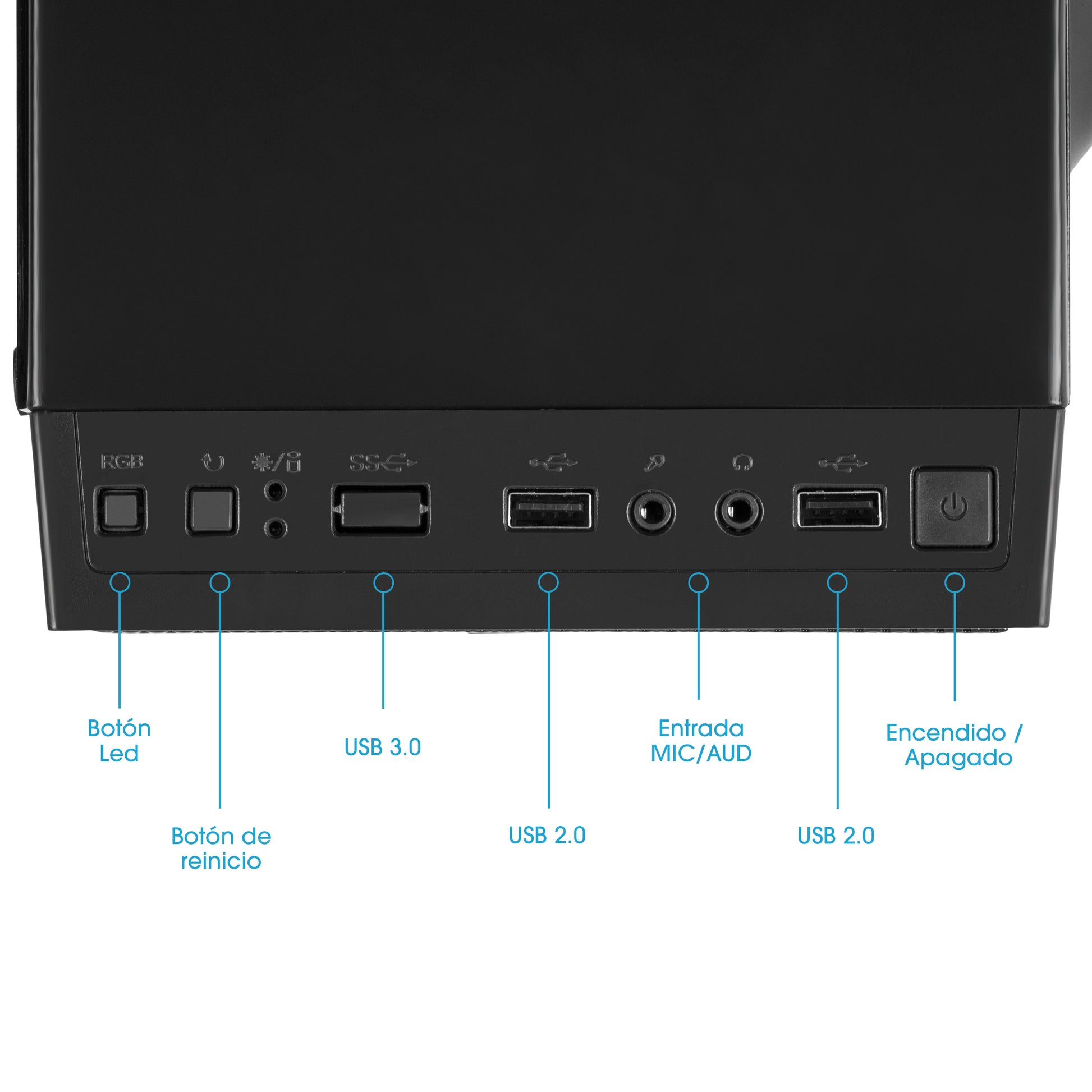 Panel superior con puertos USB 3.0 y USB 2.0, entradas de audio y micrófono, botón de encendido, reinicio y control de iluminación LED para un manejo práctico del sistema.