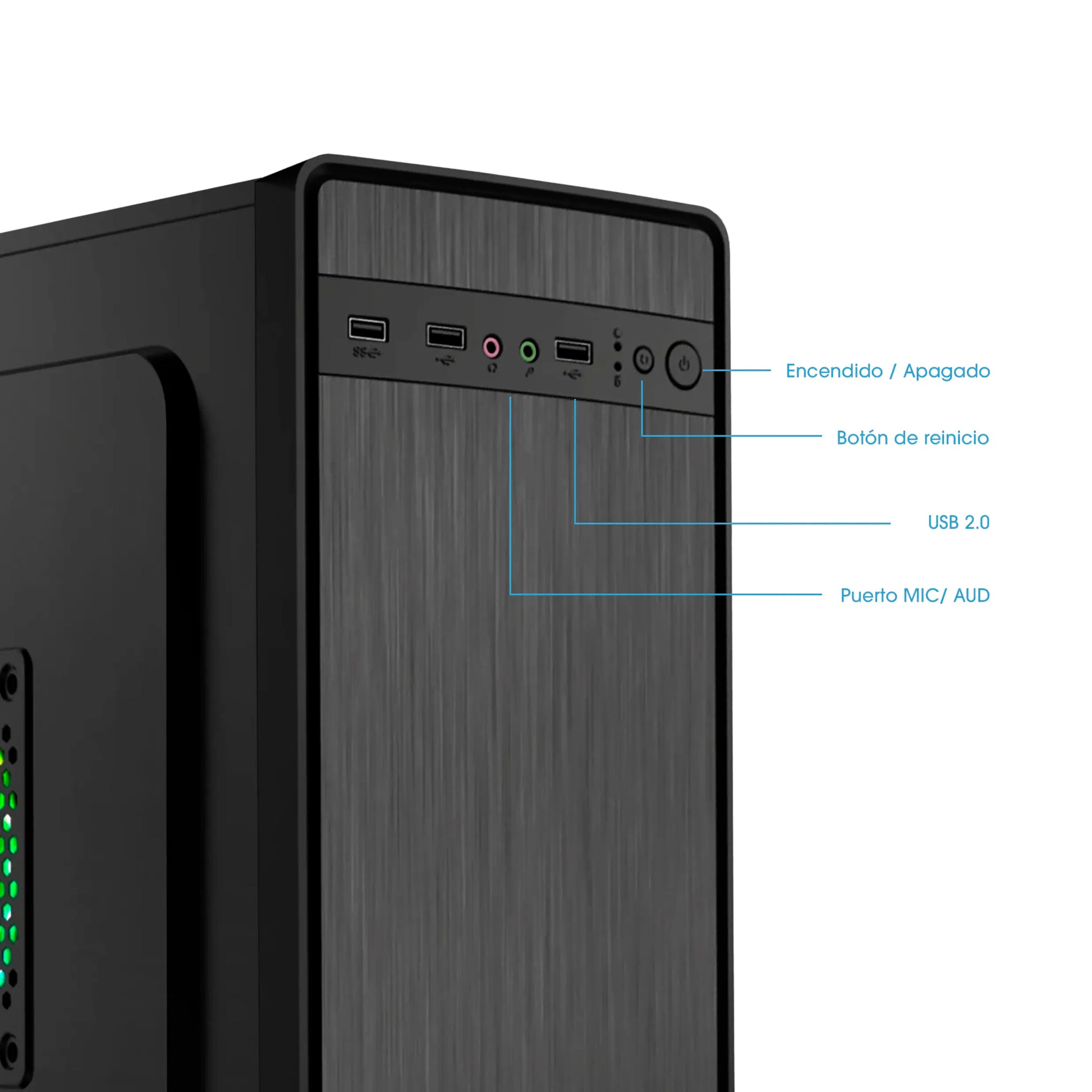 Puertos USB 2.0 y entradas de audio y micrófono ubicados al frente, junto con botones de encendido y reinicio, para un acceso rápido y cómodo en el trabajo diario.