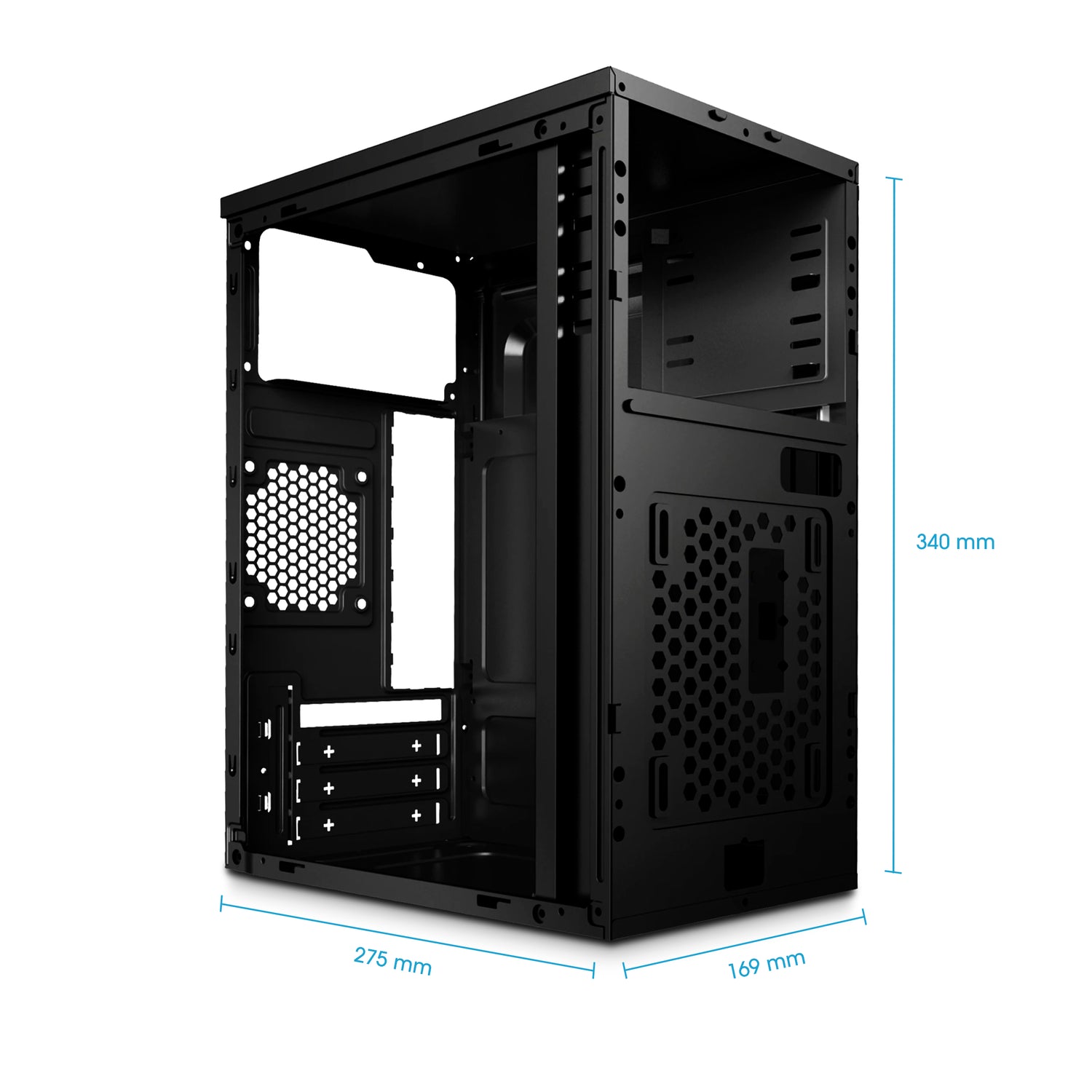 Diseño compacto con espacio para placa Micro-ATX, tarjeta gráfica y componentes esenciales, facilitando un montaje ordenado y un uso eficiente del espacio.
