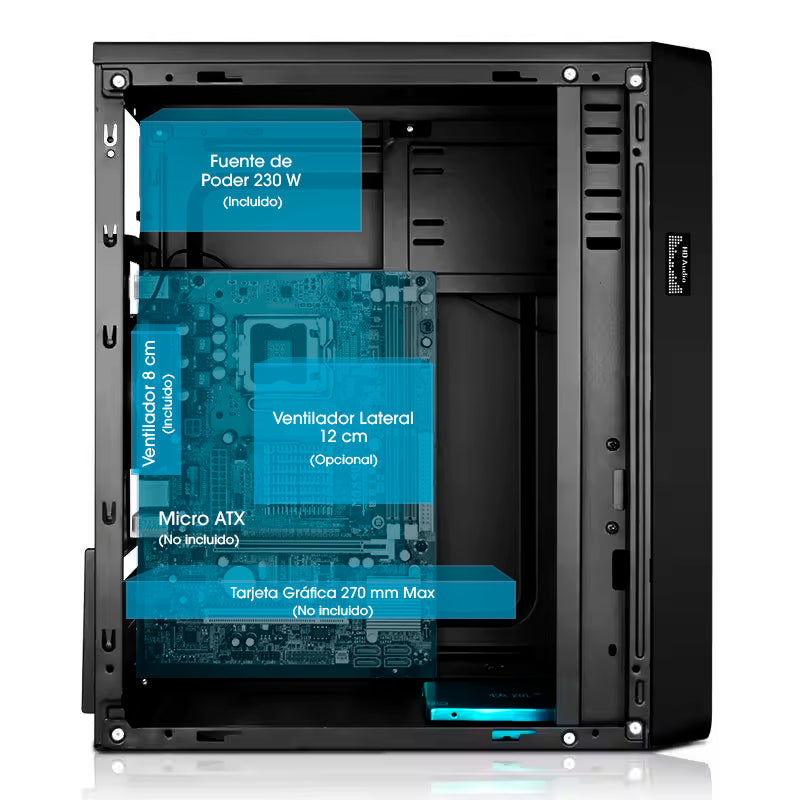 Incluye fuente de poder de 230 W, soporte para placa Micro-ATX y espacio para tarjeta gráfica de hasta 260 mm, ofreciendo una base práctica y lista para armar equipos de oficina o uso diario.
