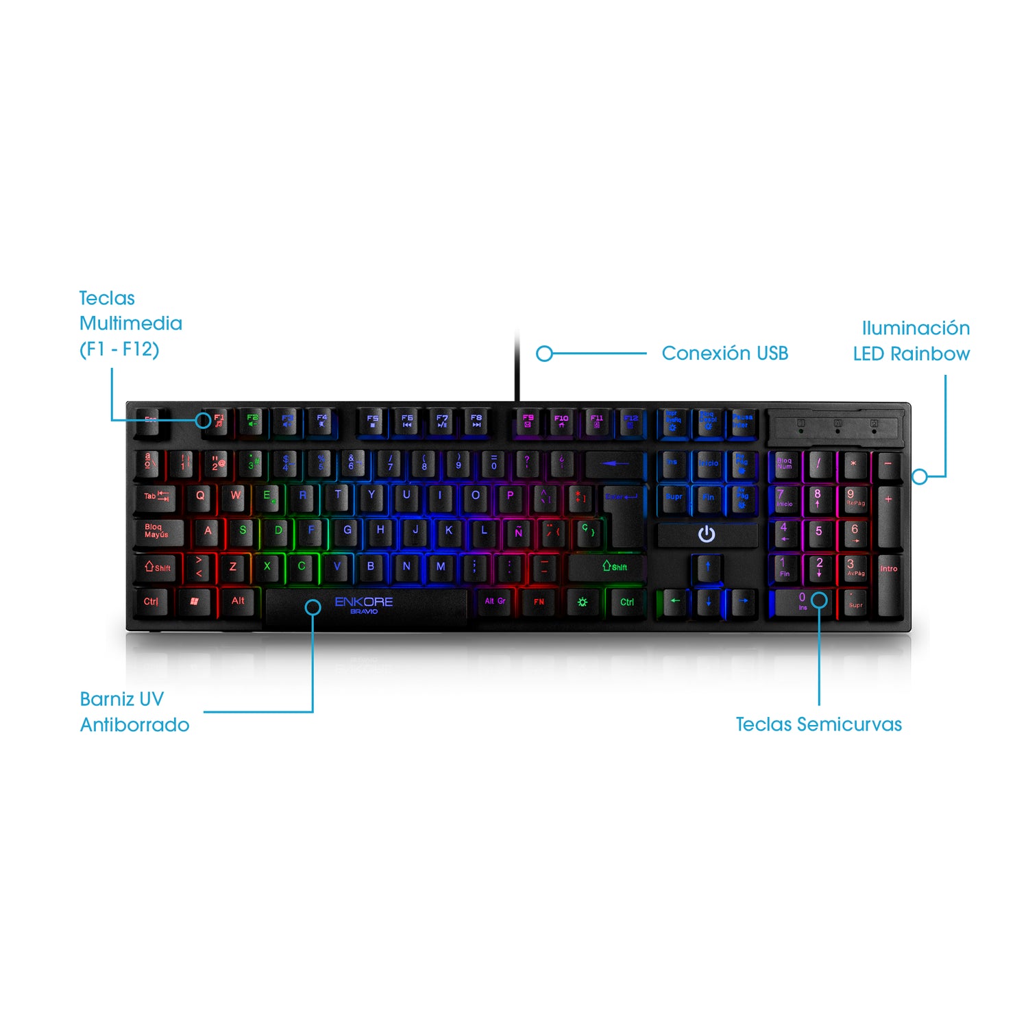 Teclado con iluminación LED Rainbow que resalta cada tecla y le da vida a tu setup. Incorpora teclas multimedia (F1–F12) para accesos rápidos, teclas semicurvas que brindan una pulsación más cómoda y barniz UV antiborrado para mayor durabilidad frente al uso diario. Su conexión USB asegura una respuesta estable y confiable tanto para jugar como para trabajar.