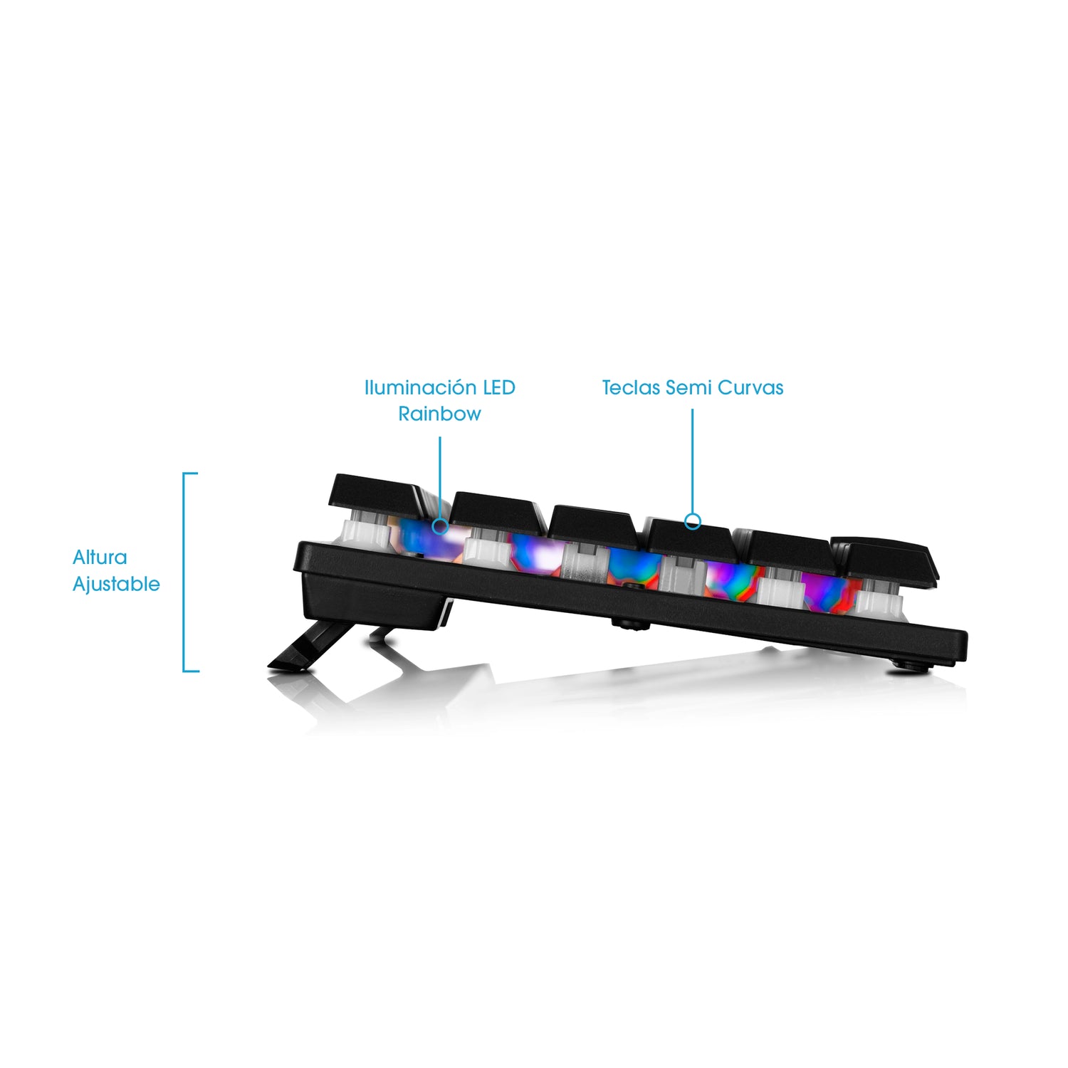 Las teclas semicurvas ofrecen una pulsación más natural, reduciendo la fatiga en sesiones largas. Su altura ajustable permite encontrar el ángulo ideal de uso, mientras la iluminación LED Rainbow acompaña cada movimiento y le da un look gamer moderno a tu escritorio.