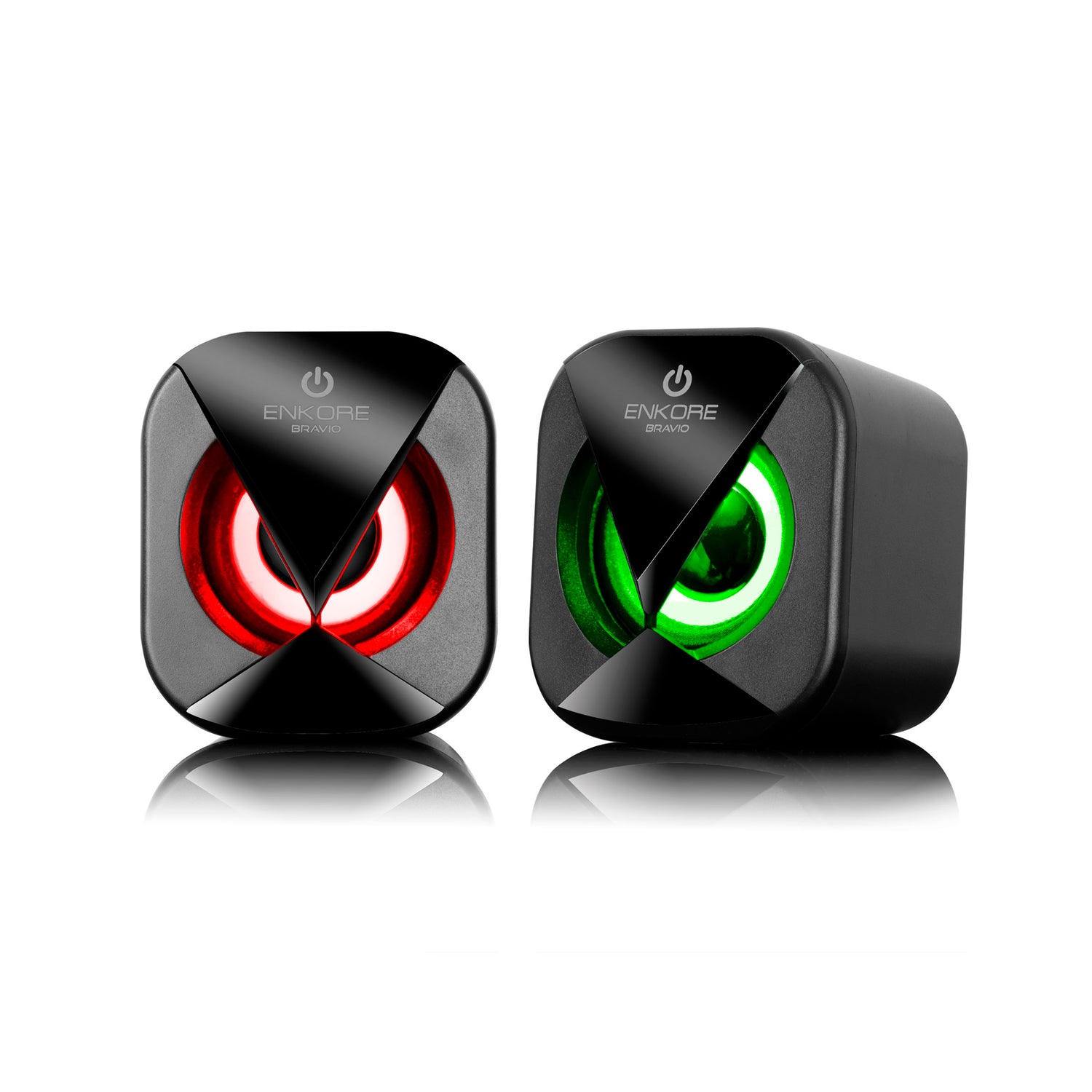 Parlantes compactos con iluminación LED que ofrecen un sonido claro y funcional, ideales para trabajo diario, estudio o entretenimiento ligero.