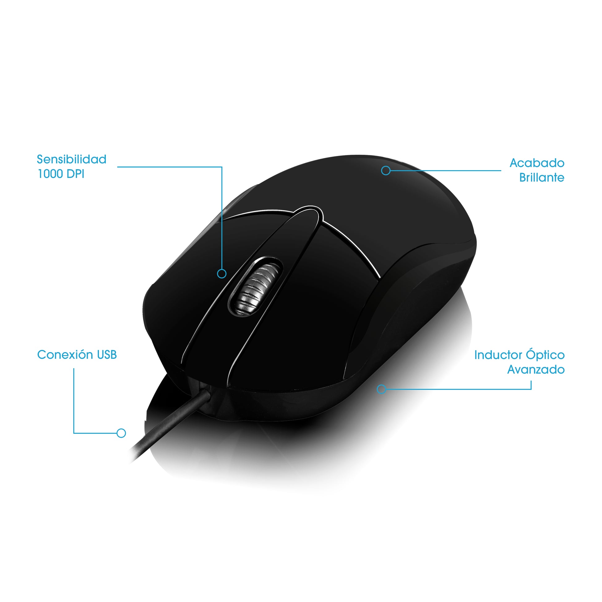 Mouse con sensor óptico de 1000 DPI, conexión USB y acabado brillante, ideal para un uso fluido y confiable en oficina, estudio o tareas cotidianas.