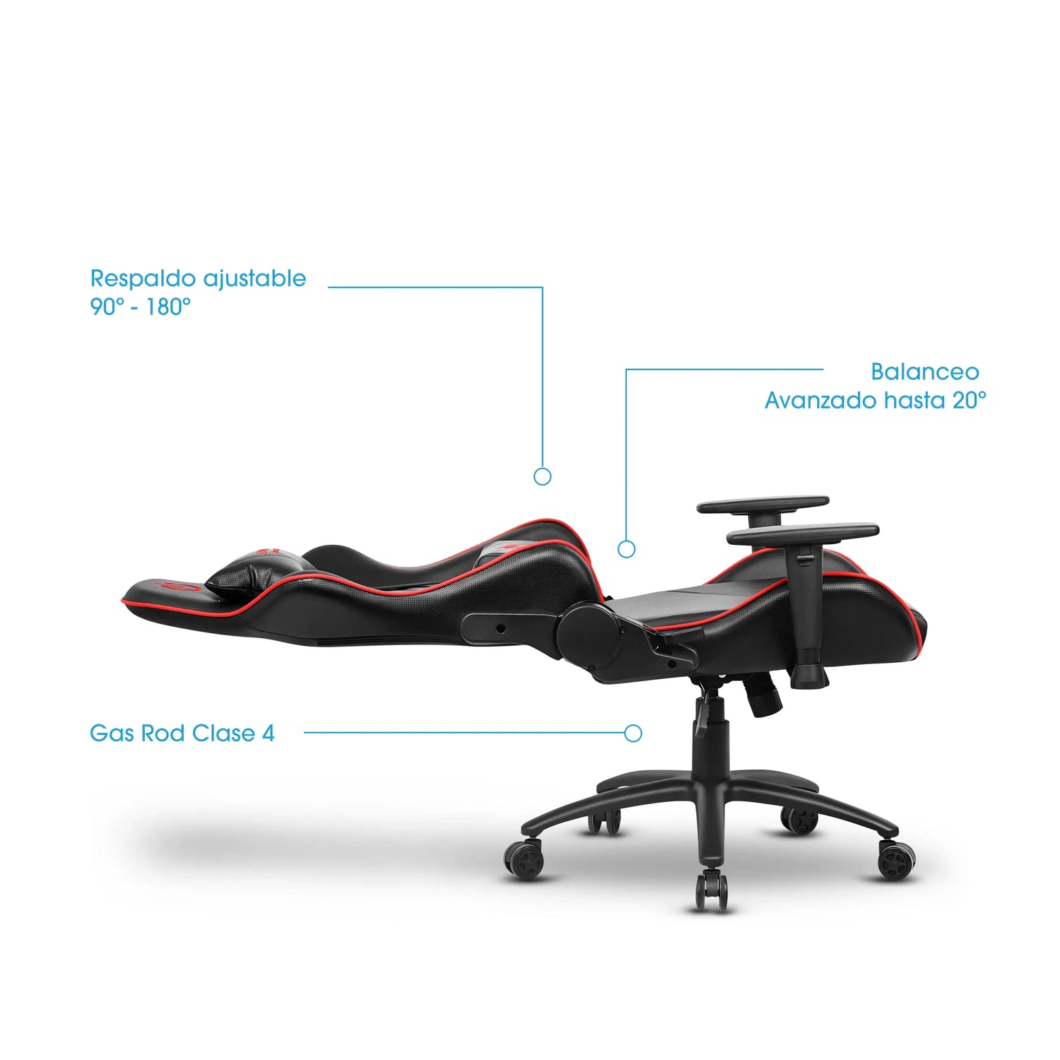 Su respaldo reclinable de 90° a 180° te permite pasar fácilmente de una postura activa a una posición de descanso total, ideal para relajarte entre sesiones de juego o trabajo.