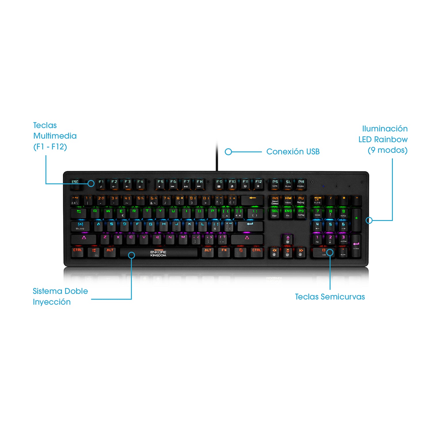Este teclado combina teclas multimedia (F1–F12) para accesos rápidos, conexión USB estable y una llamativa iluminación LED Rainbow con 9 modos, que realza cada partida o jornada de trabajo. Su sistema de doble inyección mejora la durabilidad de las leyendas, mientras que las teclas semicurvas ofrecen una escritura más cómoda y precisa, ideal para largas sesiones frente al computador.