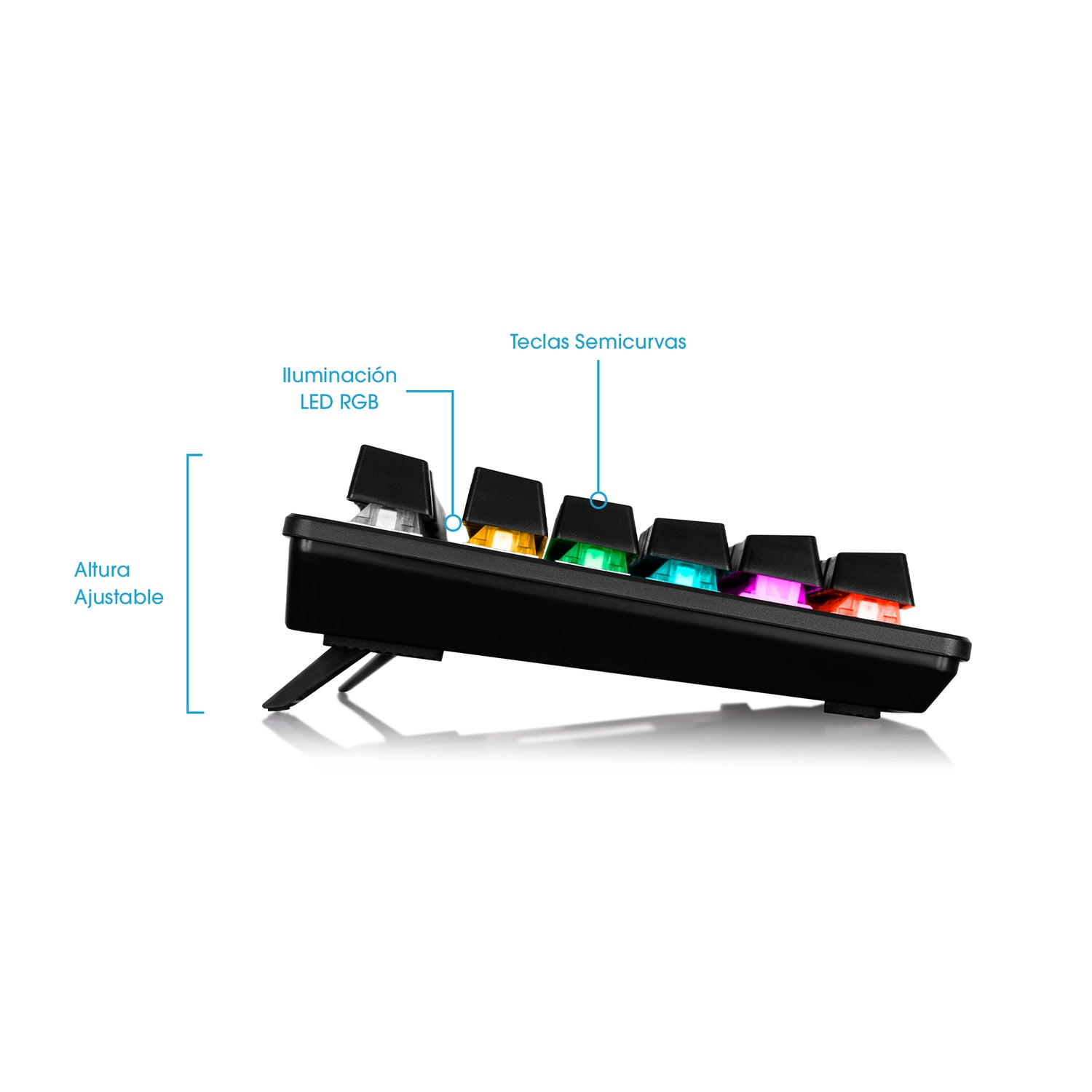 Su altura ajustable permite adaptar el ángulo del teclado a tu postura ideal, reduciendo la fatiga durante sesiones prolongadas. Las teclas semicurvas brindan una sensación más natural y cómoda al escribir o jugar, mientras que la iluminación LED RGB aporta un look moderno y envolvente que realza tu setup y mejora la visibilidad en cualquier ambiente.