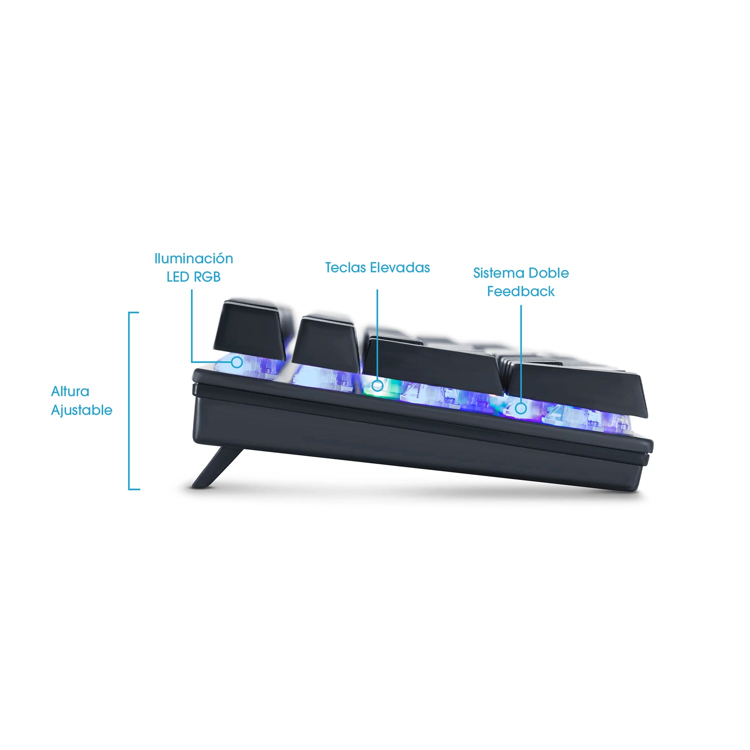 La iluminación LED RGB integrada realza el setup y mejora la visibilidad en ambientes con poca luz, mientras que la altura ajustable permite adaptar la inclinación del teclado según tu postura, reduciendo la fatiga durante largas jornadas.